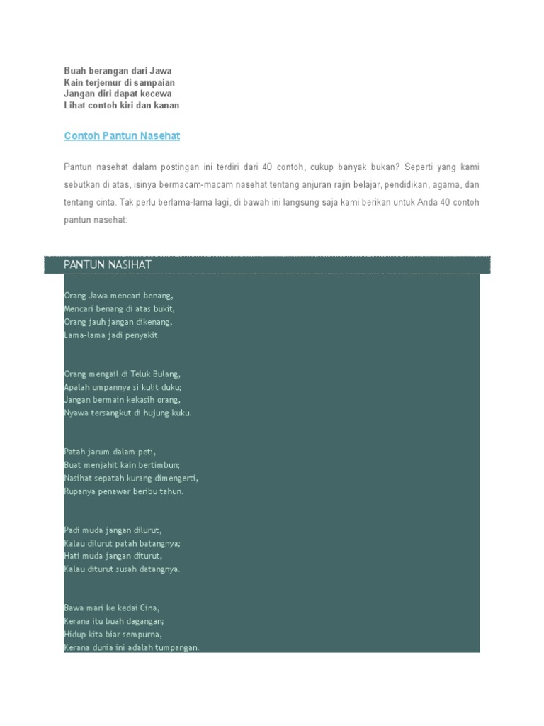 Mulai dari contoh pantun nasehat orang tua contoh pantun nasehat agama contoh pantun nasehat anak contoh pantun nasehat belajar dan contoh pantun nasehat dan maknanya. Islam untuk beribadah sesuai dengan agamanya. Melenguh lembu di gunung melenguh sampai ke balai.