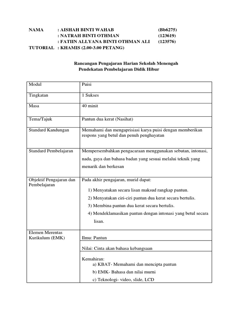 Contoh rancangan pengajaran harian. Pengalaman dan pemerhatian tersebut diungkapkan semula dalam baris baris yang walaupun terhad tetapi tidak menjejaskan mesej yang hendak disampaikan.